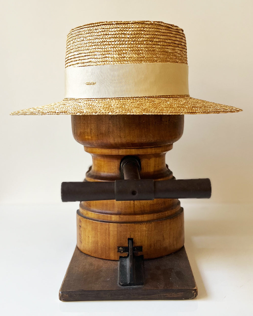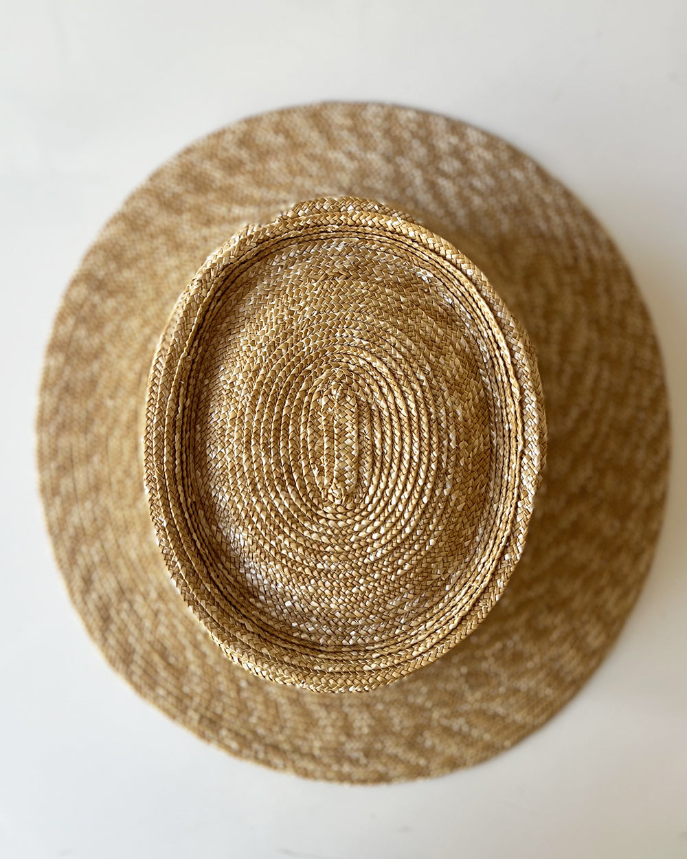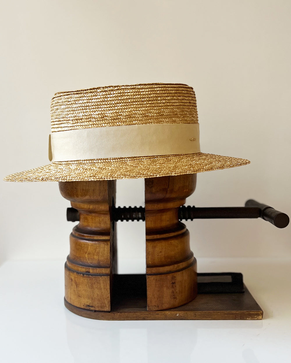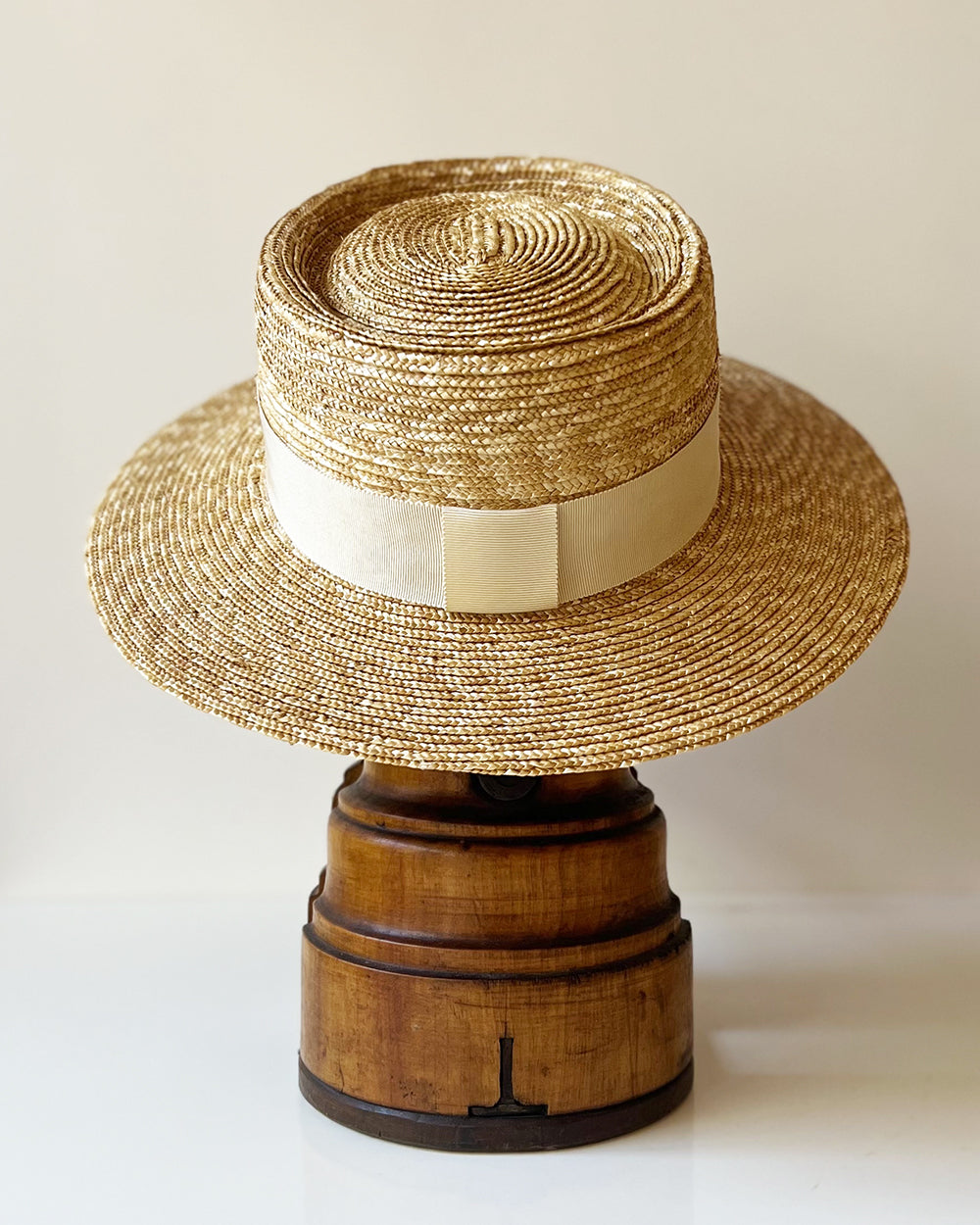 Chapeau Canotier Denise en paille cousue, orné d'un ruban ton/ton.