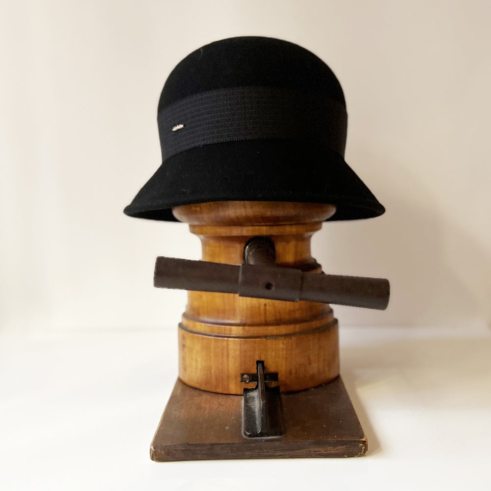Chapeau rétro en feutre mérinois noir orné d'un ruban large.